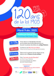 Pour fêter les 120 ans de la loi 1905, des actions ont été mises en place par la Ligue de l’enseignement du Loir-et-Cher tout au long de l’année et trouveront leur aboutissement le 09 décembre 2025.