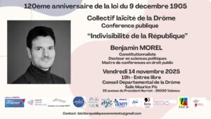 Le Collectif laïcité de la Drôme, dont est membre la Ligue de l’enseignement, organise le vendredi 14novembre une conférence publique sur « L’indivisibilité de la République ». Avec Benjamin Morel, constitutionnaliste, docteur en sciences politiques, maître de conférence en droit public, auteur de « Les bases du droit constitutionnel » Editions Belin.