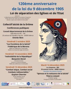 – d’octobre à janvier, pour fêter dignement l’anniversaire des 120 ans de cette loi fondatrice , 4 conférences exceptionnelles, animées par des personnalités incontestées, sur des thèmes porteurs du sens profond de la laïcité
