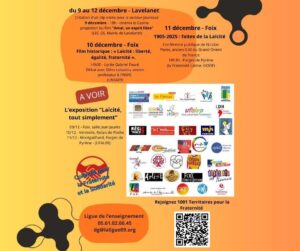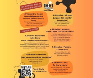 Ci-dessous le programme des manifestations prévues pour cette fin d’année et labellisées dans la cadre de la campagne nationale « 1001 territoires pour la Fraternité » ainsi que celles consacrées aux 120 ans de la loi de 1905 proposées par le collectif laïque.