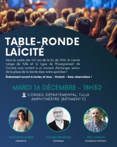 La Ligue de l’Enseignement – FAL De la Corrèze et le cercle laïque de Tulle organisent le 16 décembre une table ronde sur la laïcité avec :Valentine Zuber, historienne spécialiste de l’histoire de la laïcité, de la liberté religieuse et des droits humains,