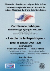 En hommage à Jacques Malsert, ancien président de la fédération des Œuvres de la Drôme, ardent défenseur de l’école publique, laïque, sociale, notre Fédération avec le concours de la Loge Mosaïque du Grand Orient de France organisent une conférence publique sur le thème de « L’école de la République ».